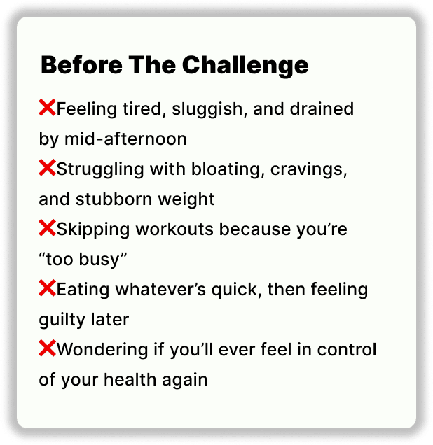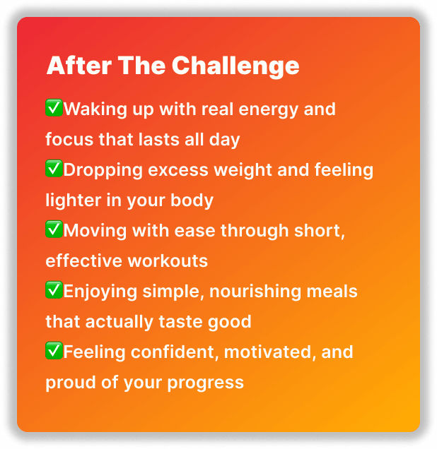 This challenge was designed for busy people. The meals are quick, the workouts are short, and the guidance is structured so you don’t waste time figuring things out.